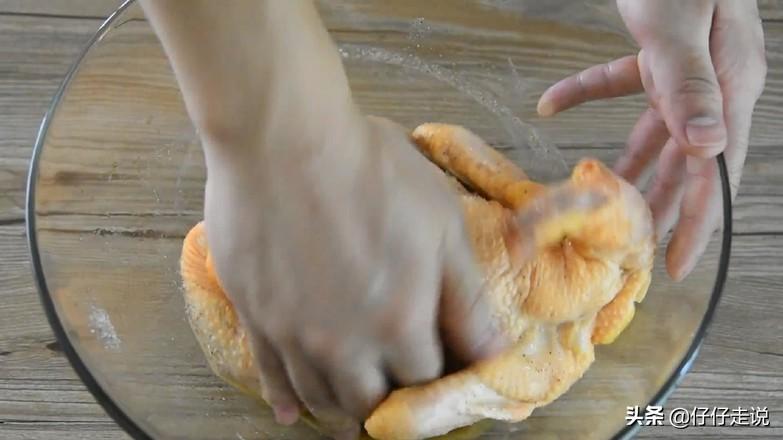 2.将放入的调味料均匀的涂抹于鸡的全身,里外涂抹均匀,然后腌制半小时