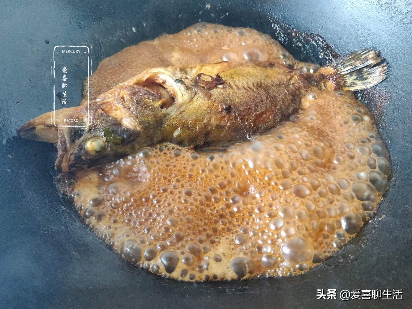 第四步 加入调料,煎制两面金黄后,加入葱姜蒜和3勺料酒爆香,然后加入香醋3勺,生抽2勺,老抽1勺上色,最后加入清水,与鱼齐平,大火烧开后转小火炖10分钟。